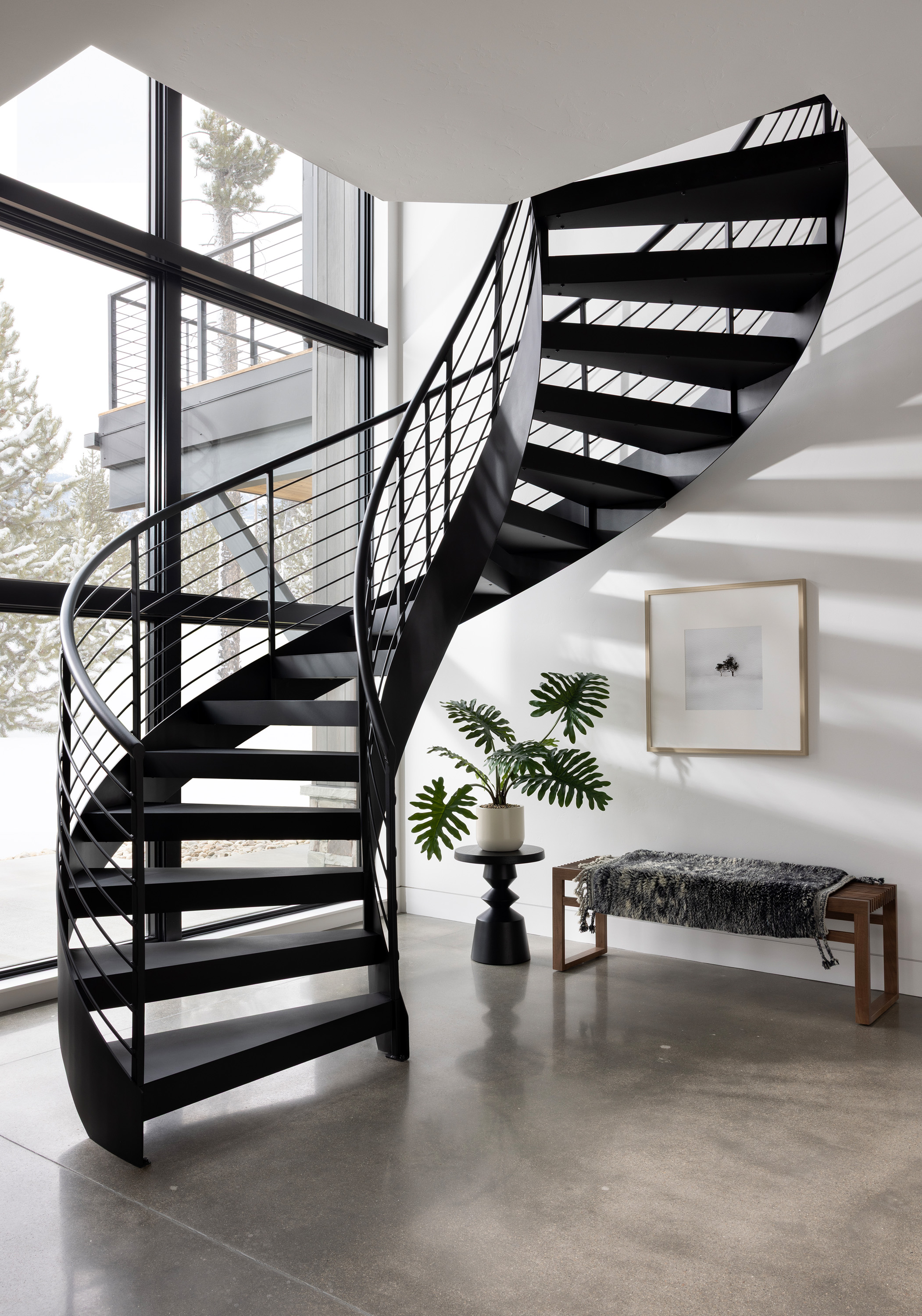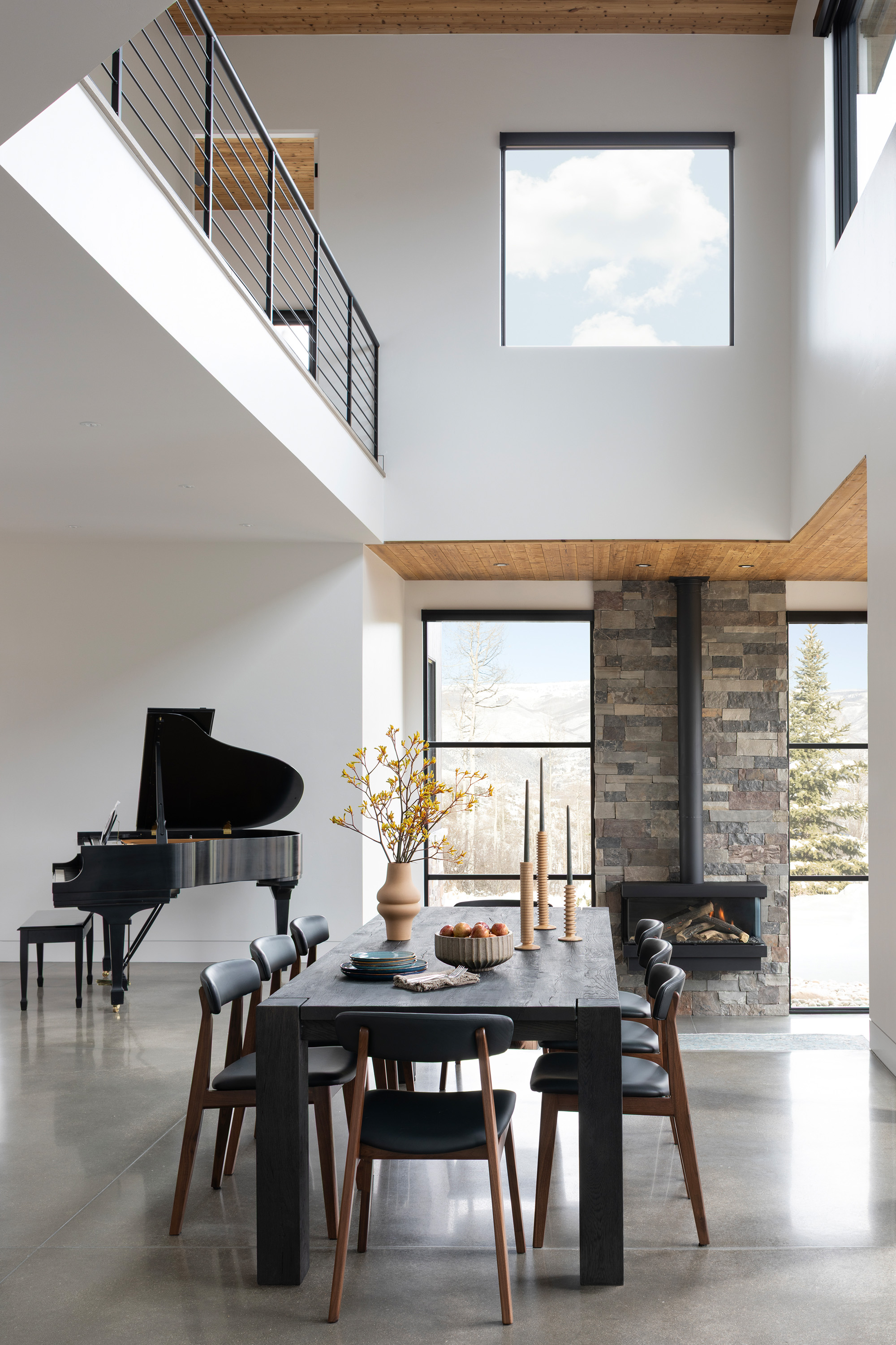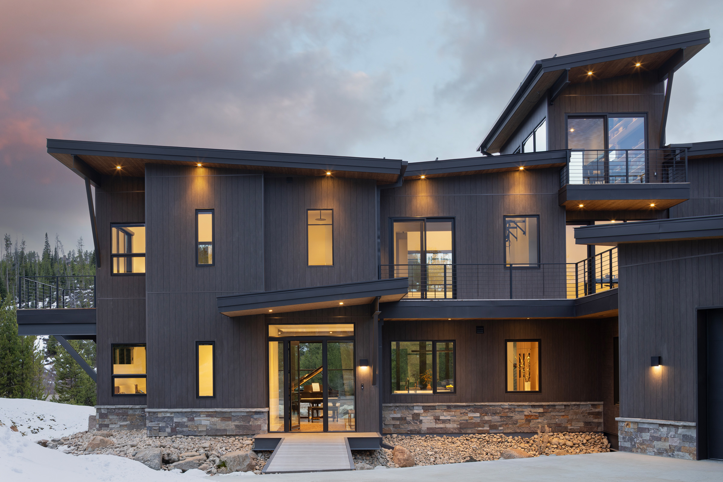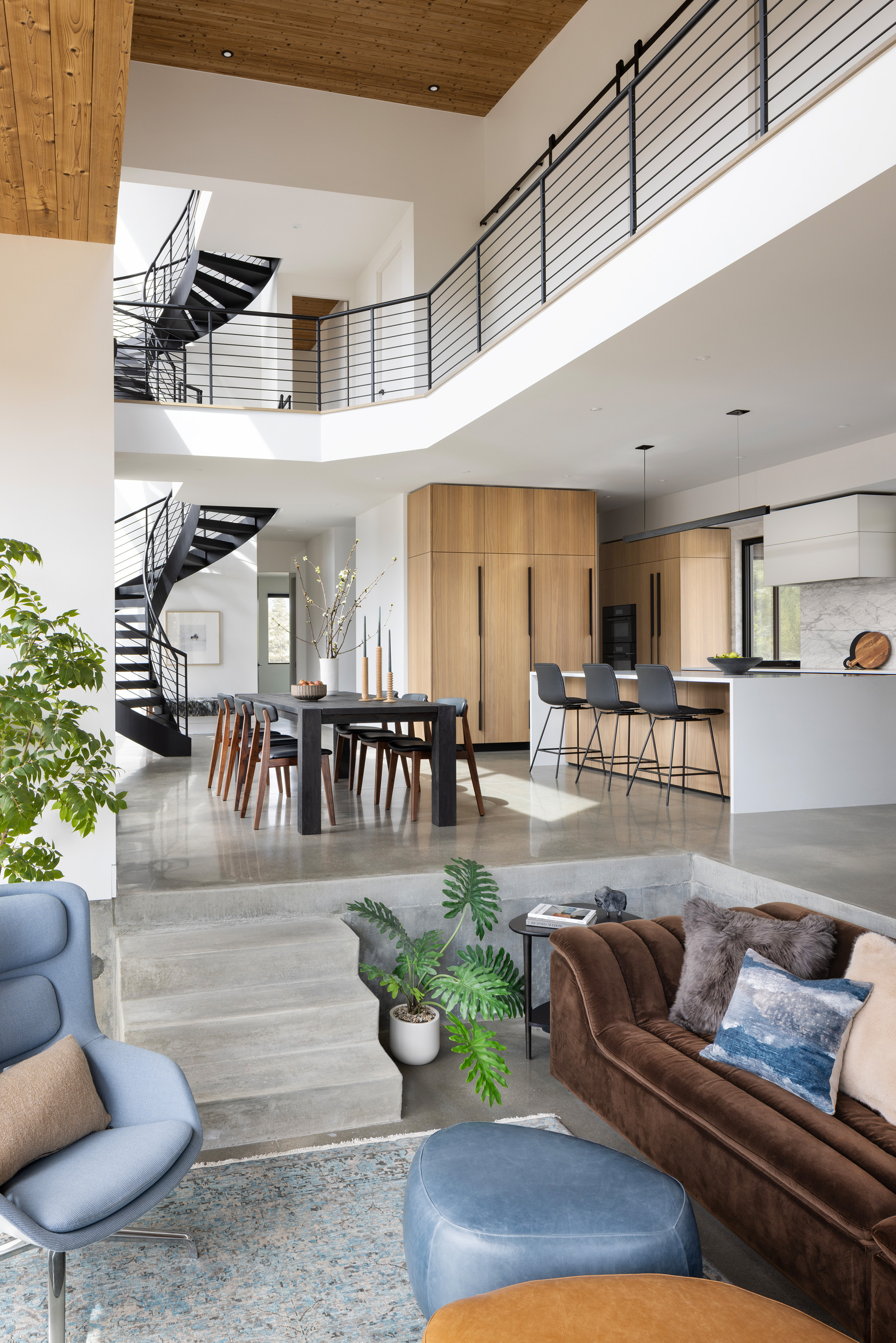 This chic stylish home sits in the mountains, complete with bridge walkway, a window-wrapped sunken living area, and an interior spiral staircase winding toward a third-level loft tower. Windows throughout strategically let in the quiet of the outdoors. These features lend themselves to a sophisticated take on an enchanting villa, one we fittingly named "Cloudwalk" for its poetic spiral toward the sky — as in music notes floating from baby grand — and its rising rooflines' expression of flight amidst a dreamy landscape.