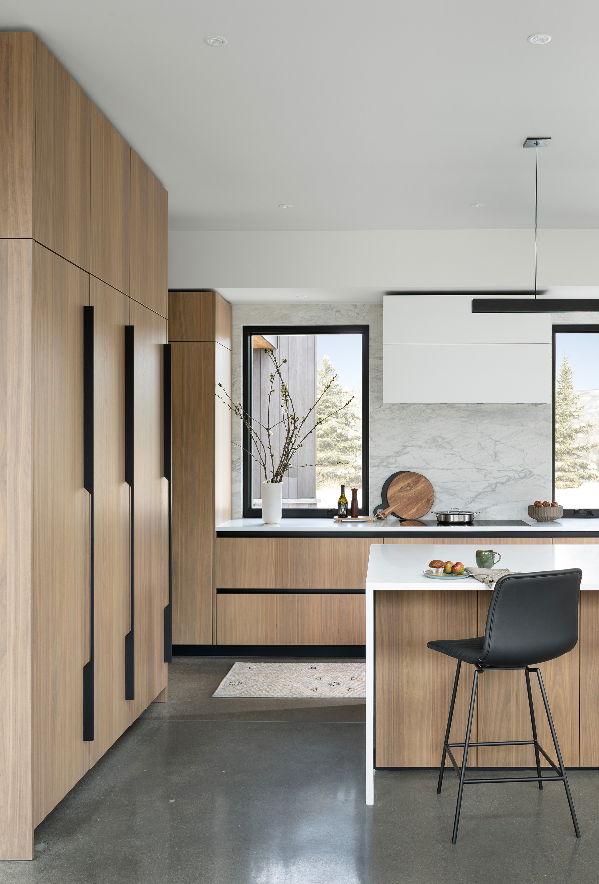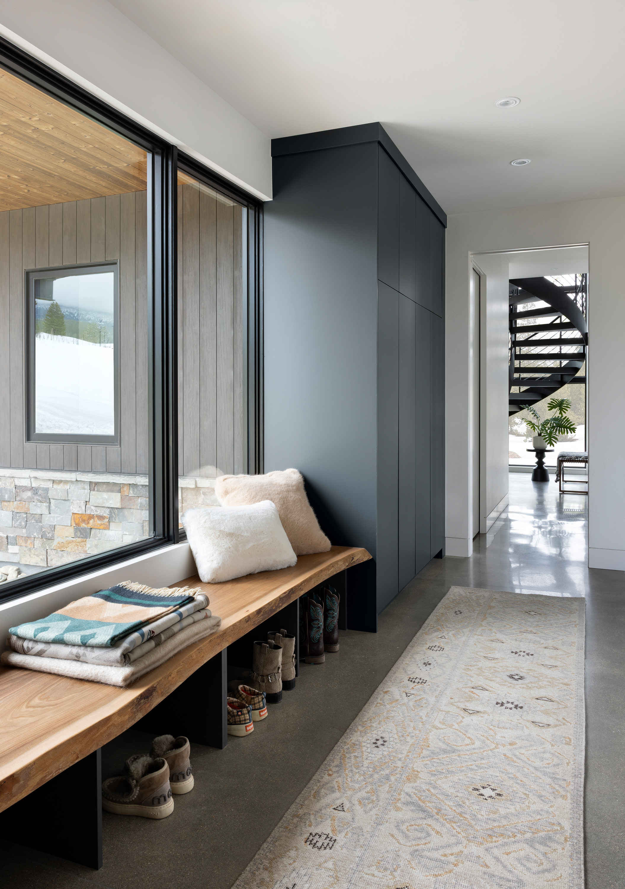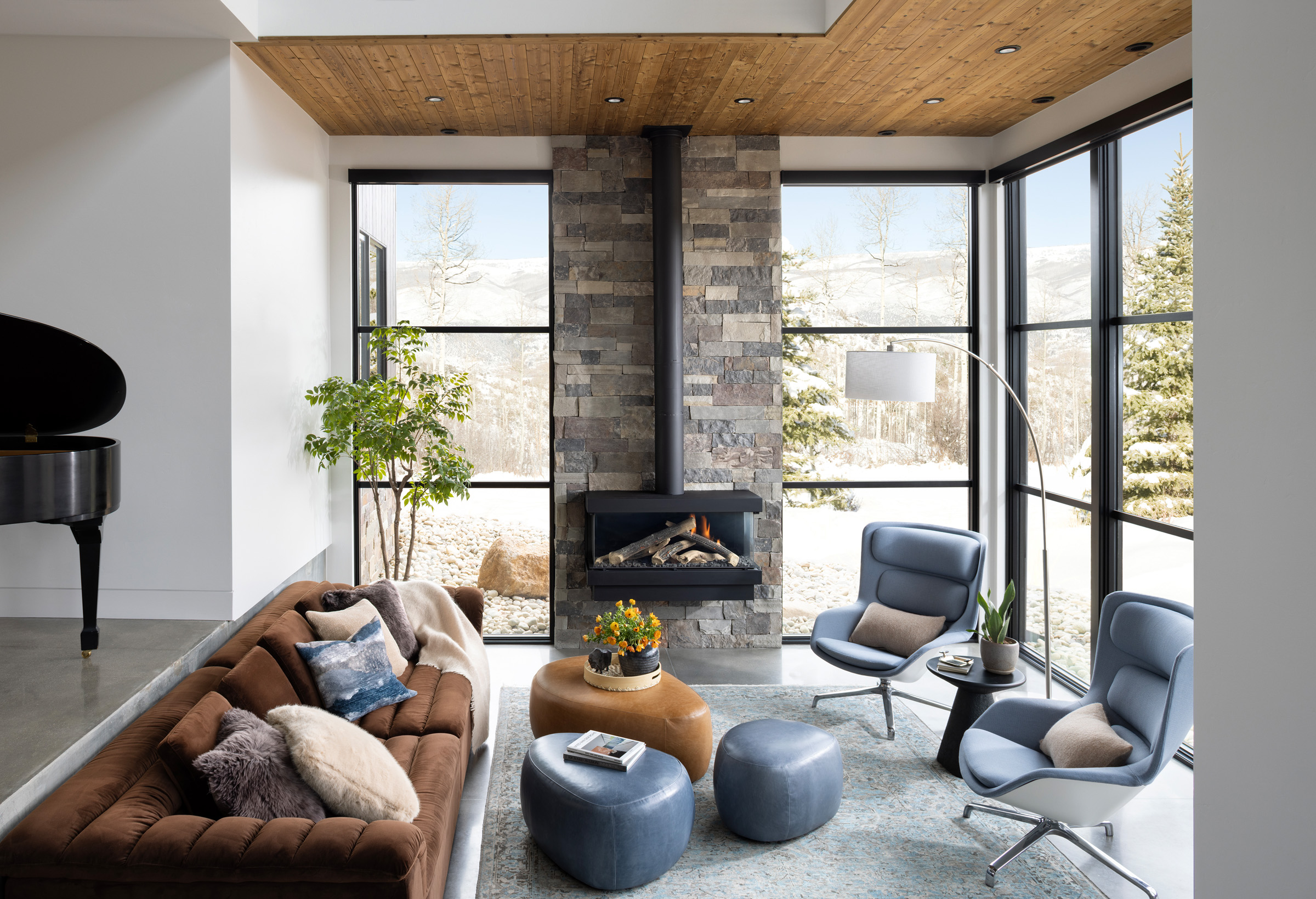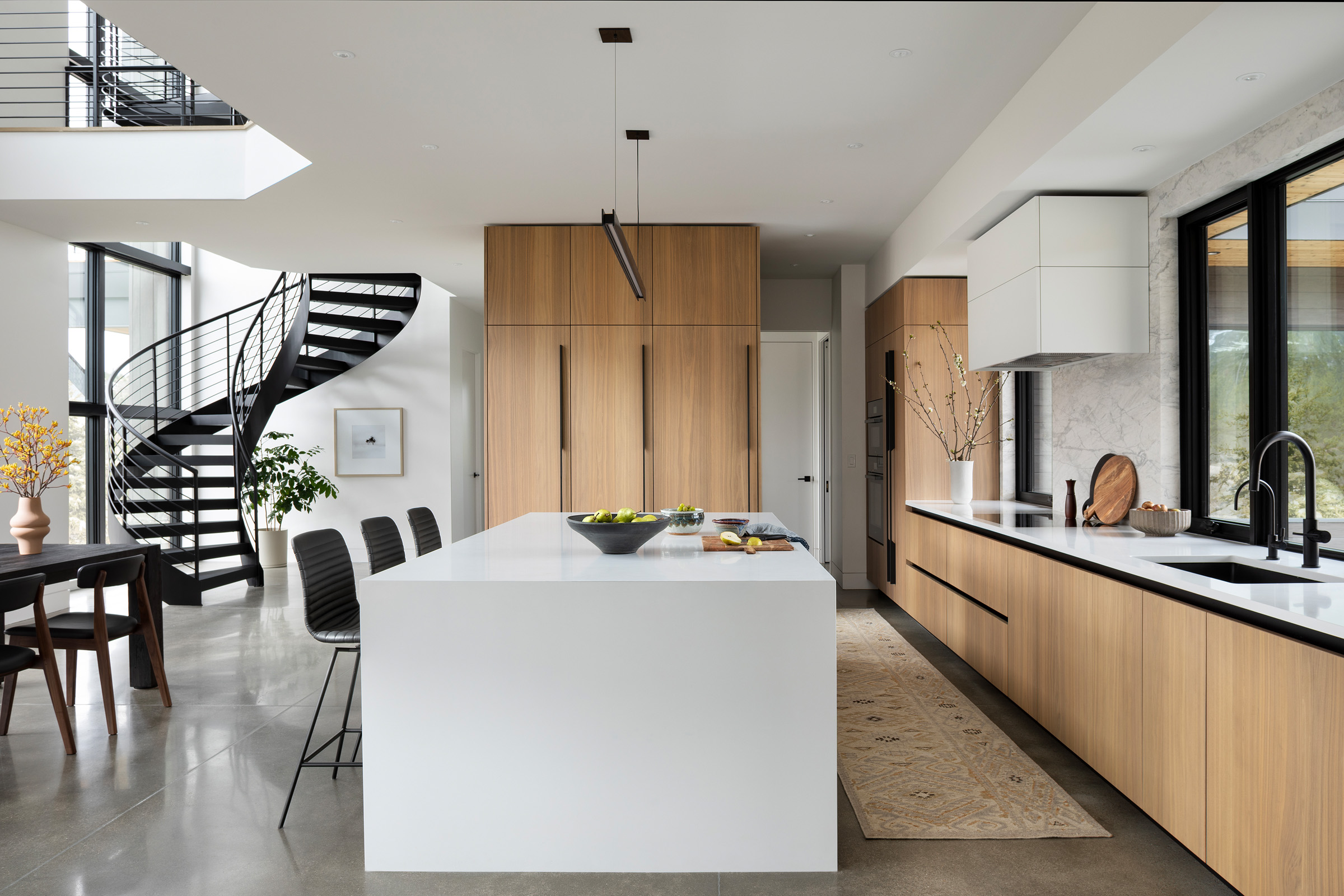 This chic stylish home sits in the mountains, complete with bridge walkway, a window-wrapped sunken living area, and an interior spiral staircase winding toward a third-level loft tower. Windows throughout strategically let in the quiet of the outdoors. These features lend themselves to a sophisticated take on an enchanting villa, one we fittingly named "Cloudwalk" for its poetic spiral toward the sky — as in music notes floating from baby grand — and its rising rooflines' expression of flight amidst a dreamy landscape.
