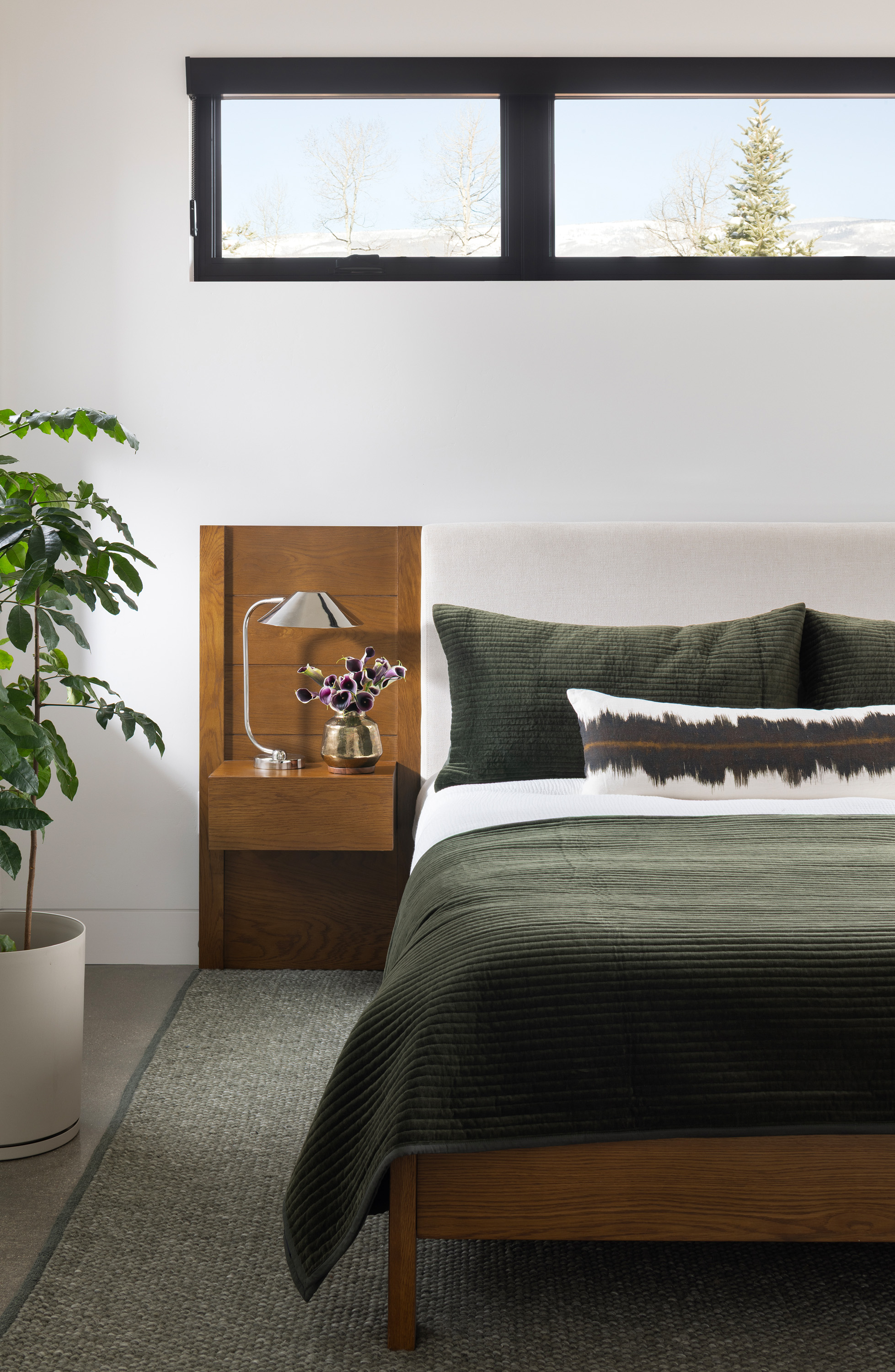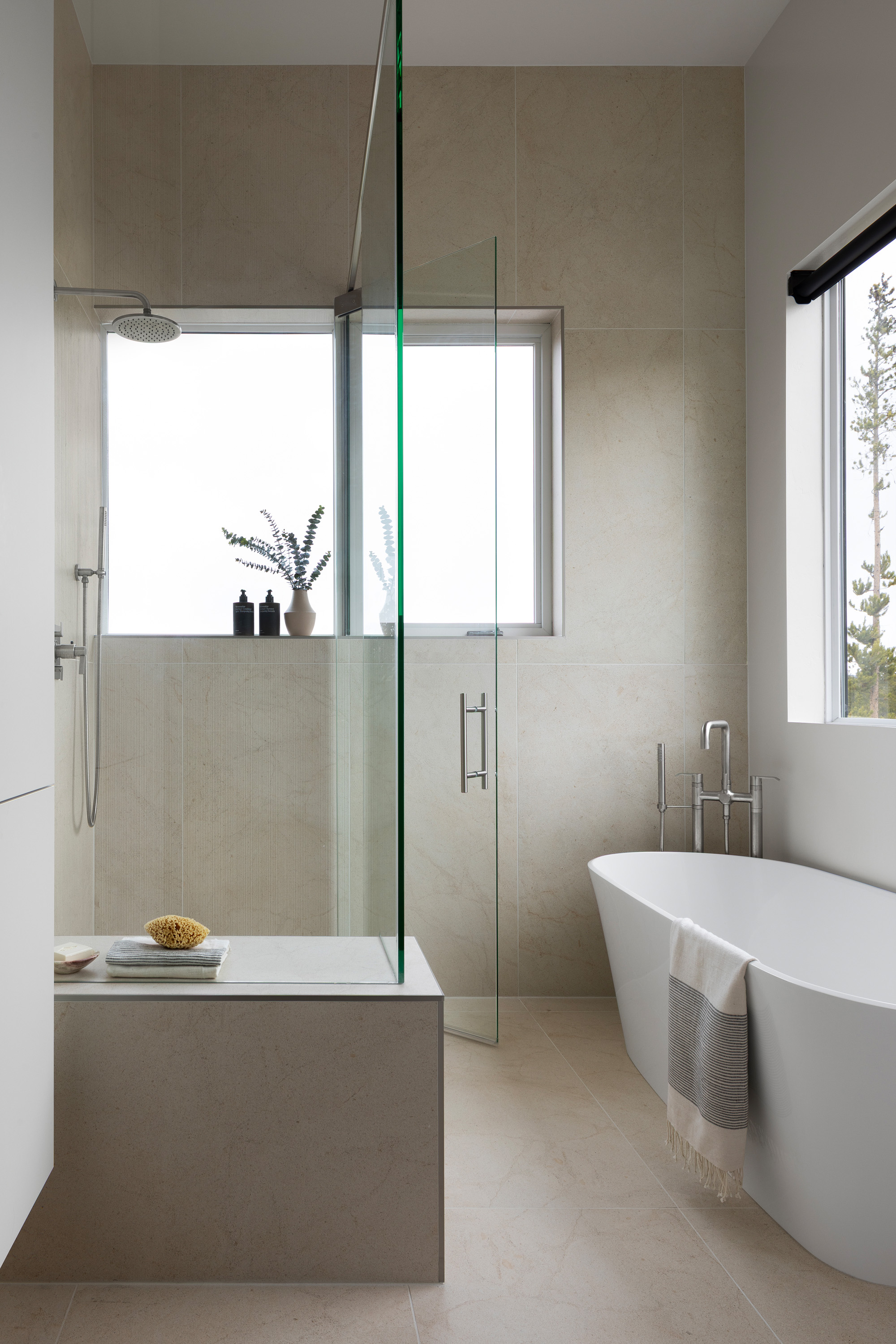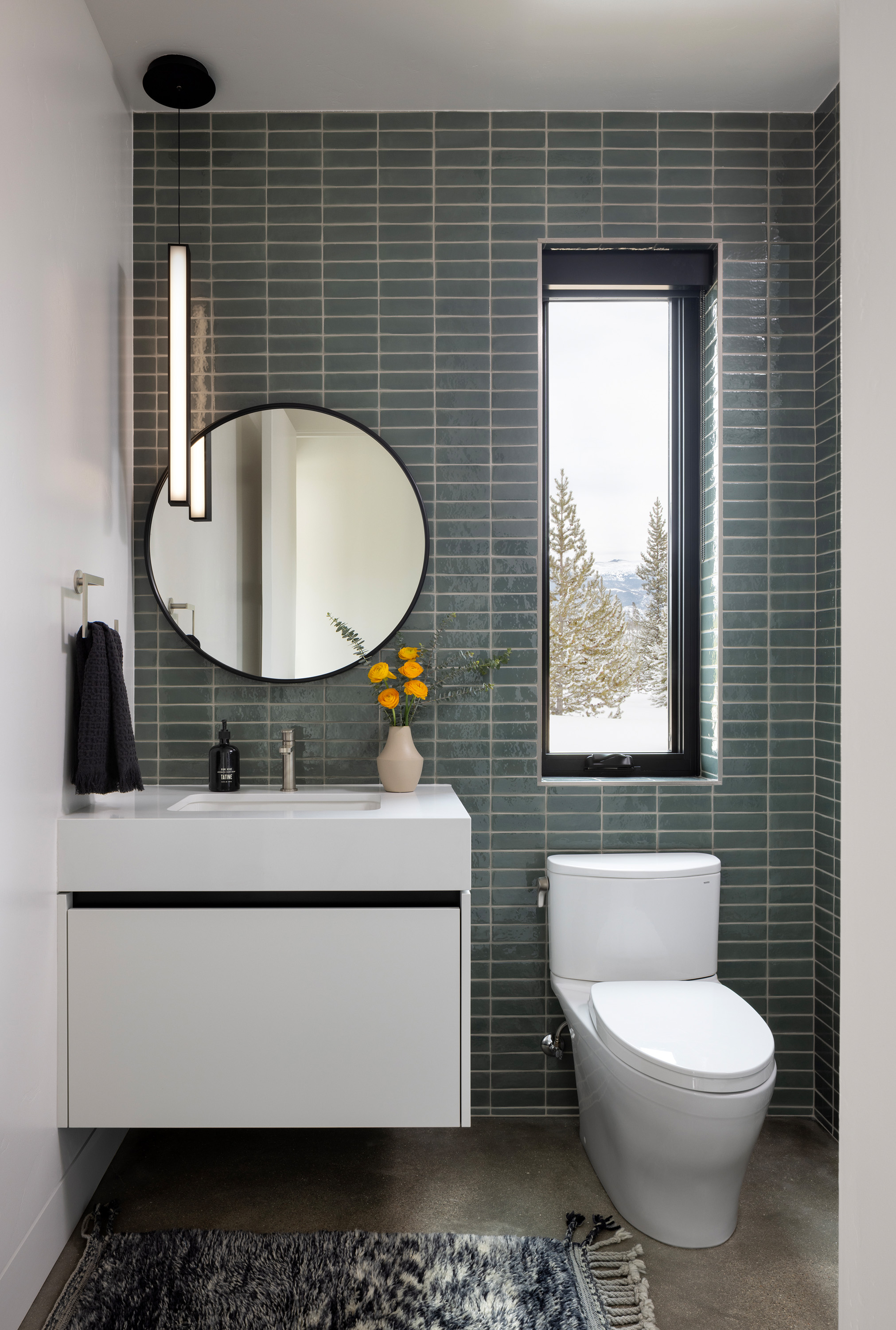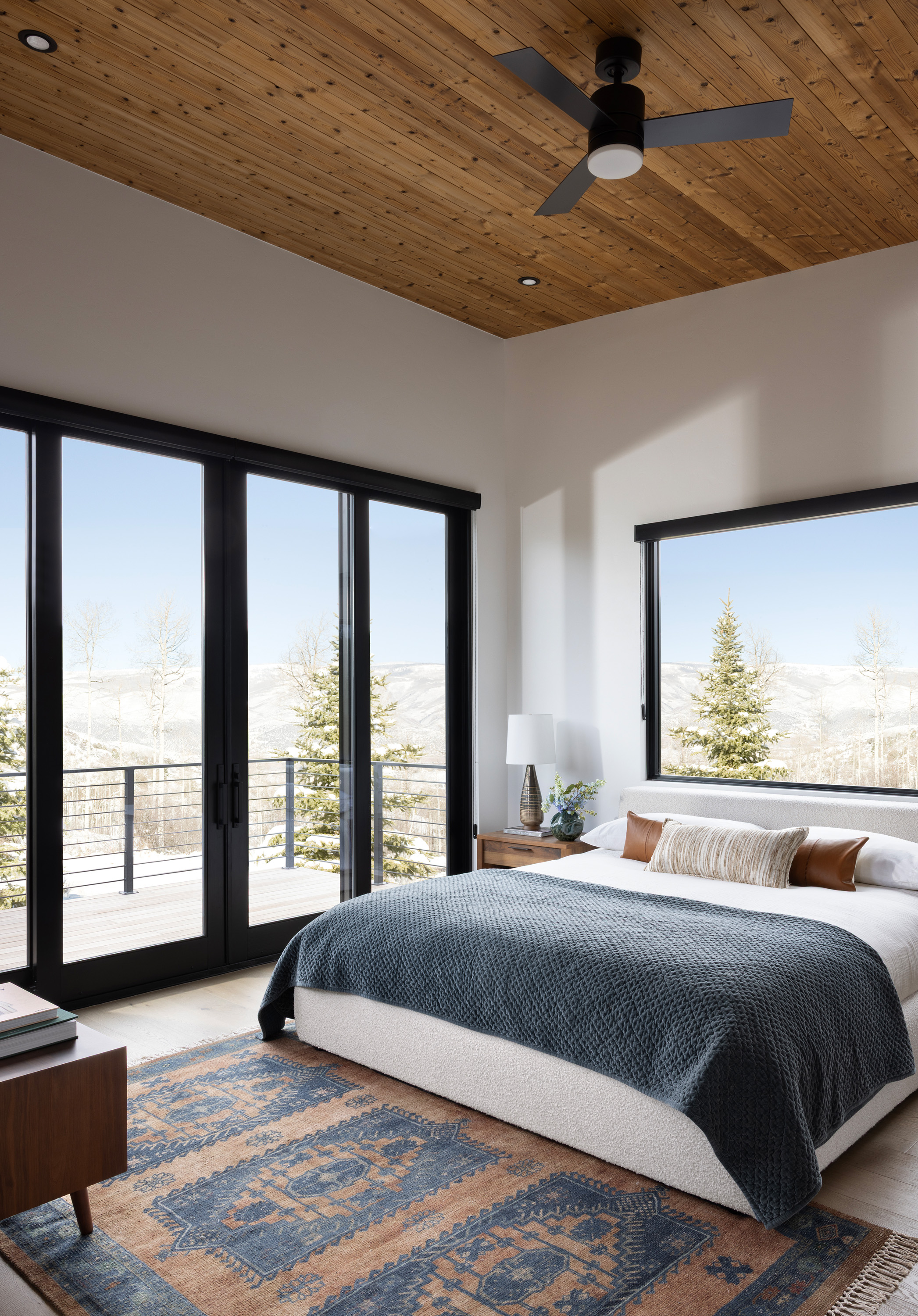 This chic stylish home sits in the mountains, complete with bridge walkway, a window-wrapped sunken living area, and an interior spiral staircase winding toward a third-level loft tower. Windows throughout strategically let in the quiet of the outdoors. These features lend themselves to a sophisticated take on an enchanting villa, one we fittingly named "Cloudwalk" for its poetic spiral toward the sky — as in music notes floating from baby grand — and its rising rooflines' expression of flight amidst a dreamy landscape.